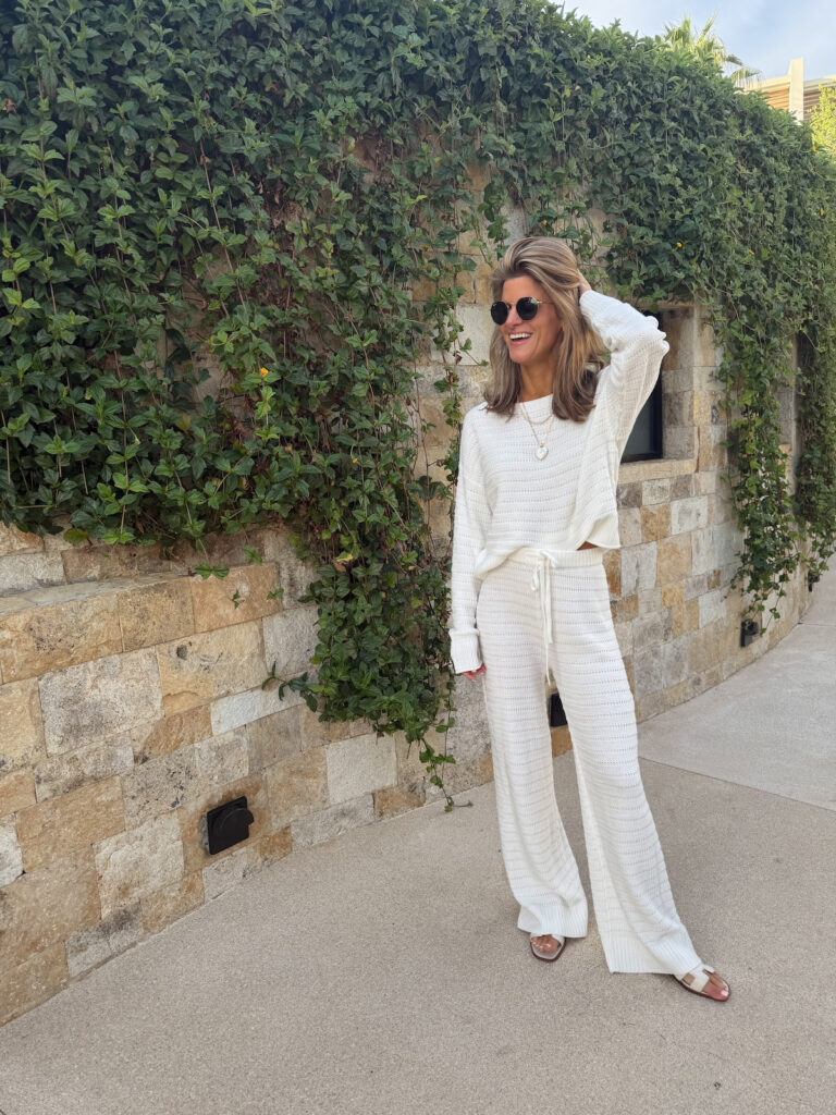 Getting on a plane is its own whole outfit challenge. I wanted to be comfortable for the flight but not look like I completely gave up on life by the time we landed. I ended up in a cream crochet pullover and matching wide-leg pants. It’s the kind of set that looks intentional but feels like pajamas. Add some simple sandals and round sunglasses and suddenly you look like you have it together. I’m all about the illusion.