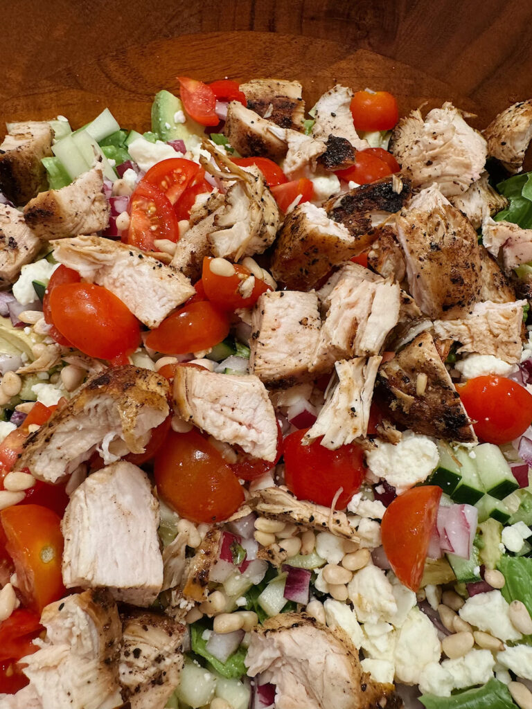 Let me be clear, my kids do not eat this salad (trust me, I’ve tried). But I do cut up plenty of extra chicken for them, which they devour. I’ll share more about how I cook the chicken shortly.